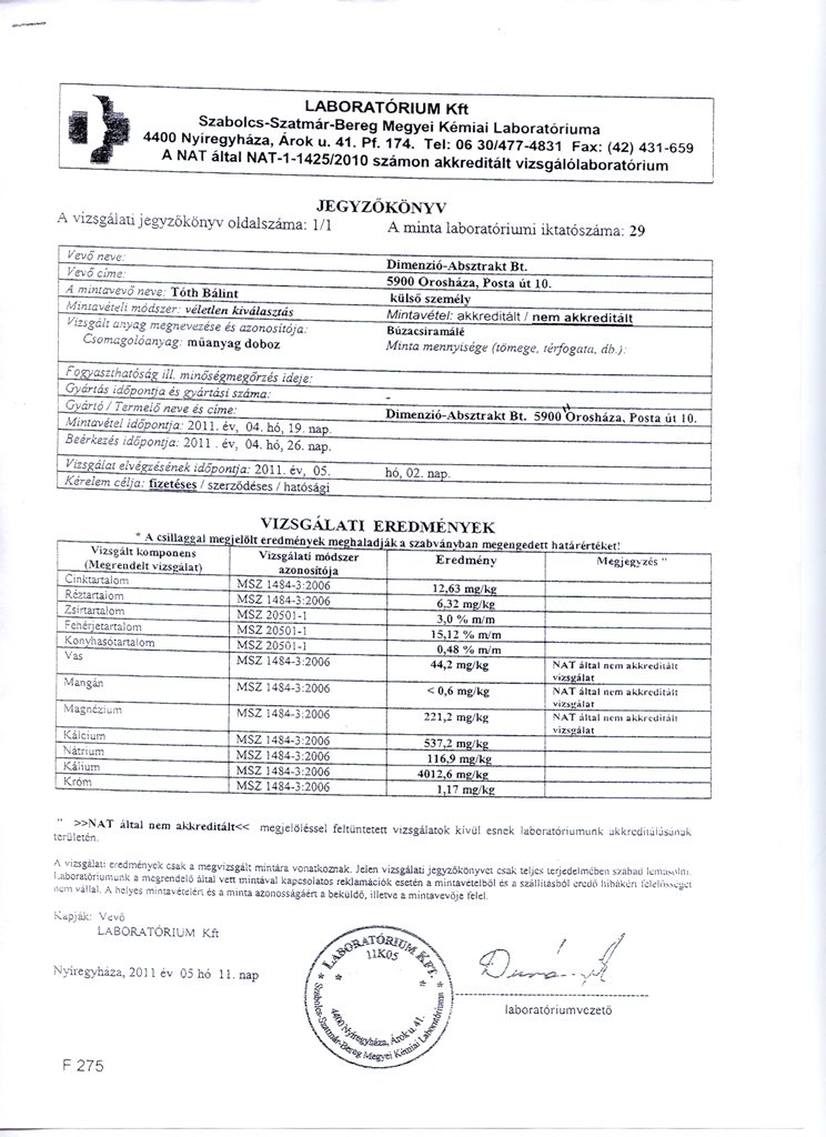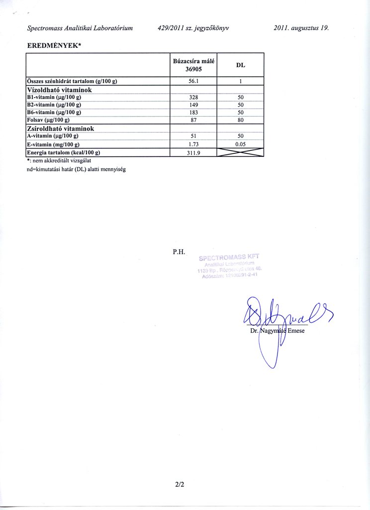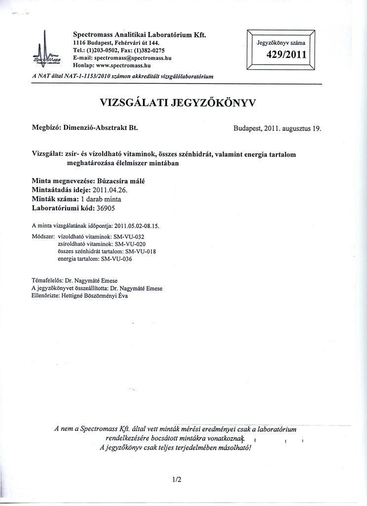 A laboratóriumi vizsgálati jegyzőkönyvek bizonyítják az orosházi csíramálé hasznos összetevőnek arányát.